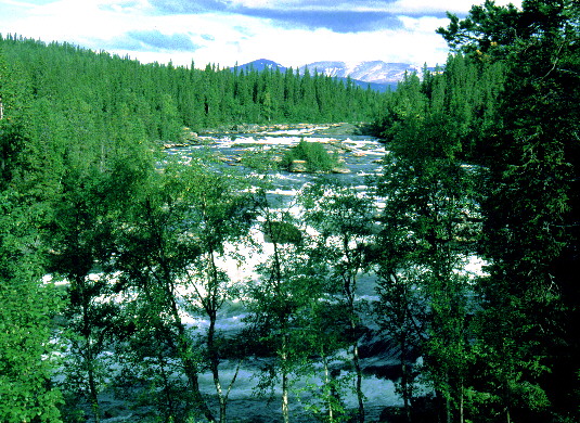 Direkt unterhalb der Fjällstation in Kvikkjokk braust der Kamajåkkå. Im Hintergrund Gipfel des Pårtetjåkkå im Sarek