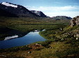 Von den Alesjaure-Hütten geht es über die Hängebrücke des Alesätno in seinem Tal aufwärts nach Süden. Direkt hinter der Brücke biegt ein Weg zum Vistasstuga und dann in das Vistasvaggi ab. Dieses herrliche Tal kann nur mit Zelt begangen werden, da es dort keine Übernachtungshütten gibt. Vom Vistasstuga kann man aber über die Nallo-Hütte nach Tjäktja bzw. Sälka auf den Kungsled zurückkehren. Nun aber auf dem direkten Weg weiter von Alesjaure nach Tjäktja. Am breit mäandernden Fluß entlang geht es durch leicht zu wanderndes Gelände. Der Blick wird immer wieder von den steilen Hängen des Azik (1315 m) auf der Westseite des Tales eingefangen. Der Bossusjohka wird auf einer Brücke passiert. Trotzdem sind auf dieser Tour immer wieder kleinere Bachläufe zu durchwaten oder auf Bohlen zu überqueren. An einem der Bäche oder Flüsse sollte man auf dieser relativ kurzen Wanderung (13 km) eine ausgiebige Mittagsrast einlegen. In der hügeligen Landschaft findet man leicht einen windstillen Platz, an dem nur noch die Rufe der Vögel daran erinnern, daß die Zeit nicht stehen bleibt. Der Kungsled biegt dann aus dem Alesätno-Tal leicht nach links in Richtung Tjäktja-Paß ab. Die Tjäktja-Hütte vor dem Paß unterhalb des Muoratistjåkka kann man schon von weitem mit dem Fernglas entdecken. Das Gelände steigt jetzt stetig an. Auf halber Strecke ist ein Fluß zu durchwaten, was aber in der Regel keine Schwierigkeiten macht. Danach geht es dann weiter bergauf. Der eigentliche Weg zur Hütte führt auf der Ostseite des Tjäuftjanjira hinauf und dann über eine Brücke zurück zur Hütte. Bei geringem Wasserstand kann man diesen Fluß auch durchwaten und somit ca. 1 km einsparen. Oberhalb der Hütte ist ein recht imposanter Wasserfall, der von "richtig harten Leuten" auch als Dusche benutzt werden kann. Bei einer Wassertemperatur von bis zu 5°C im Spätsommer hat das aber nichts mit einer gemütlichen, warmen Dusche zu tun. Vom Tjäktjastuga hat man einen wunderschönen Ausblick auf das Tal des Alesätno, der nur noch durch einen Sonnenuntergang über der westlichen Talseite übertroffen werden kann.